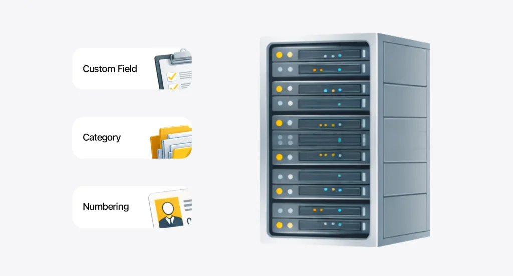 Kategori aset, field wajib, custom field, numbering/ID aset, status & kondisi