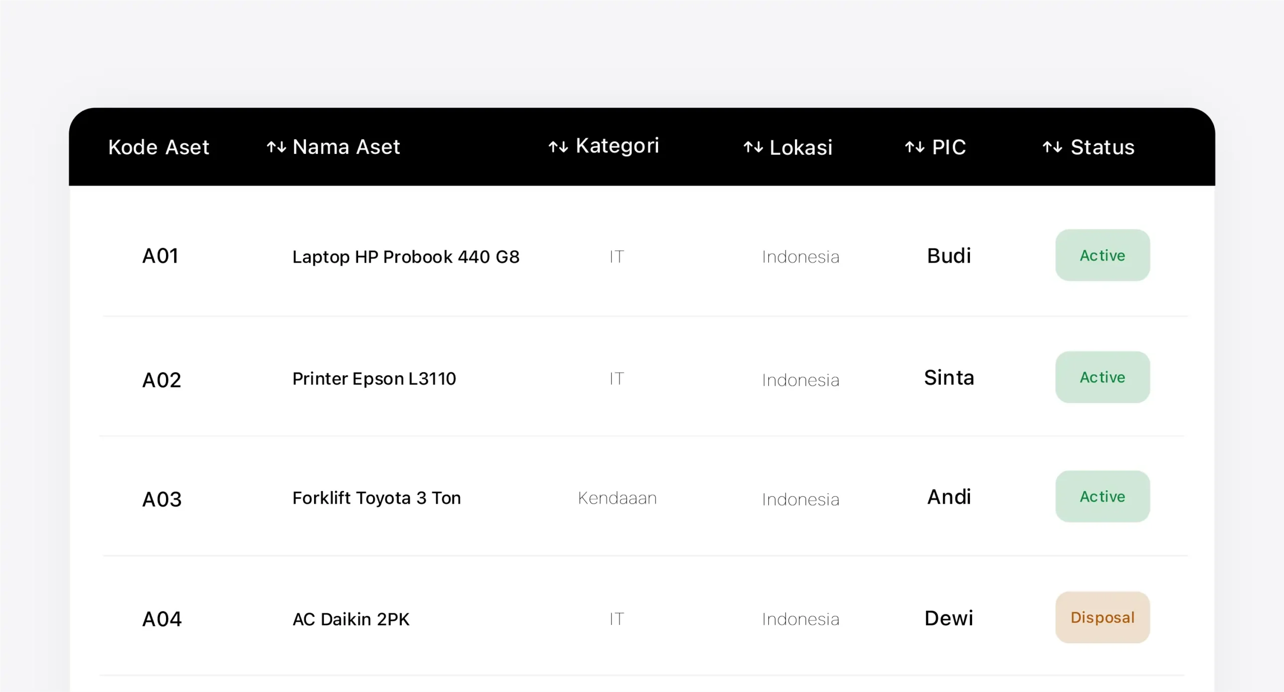 Semua jenis aset: IT & elektronik, furniture, peralatan operasional, aset fasilitas/MEP, hingga aset khusus sesuai industri (hotel, factory, hospital, school, property).
